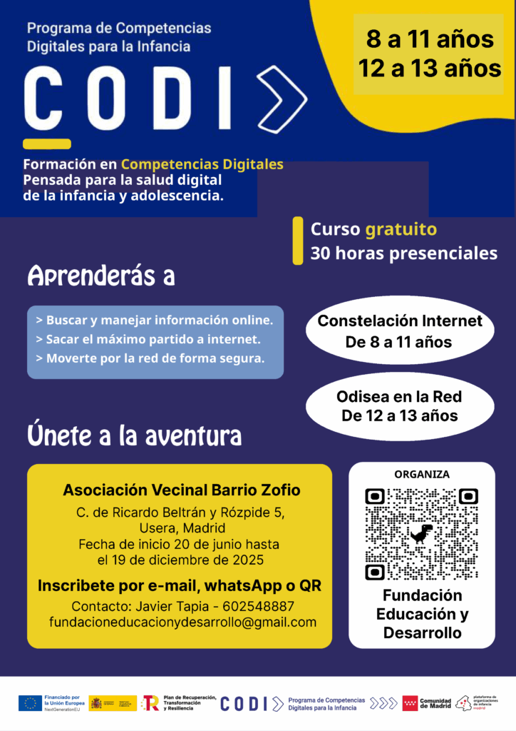 La Fundación Educación y Desarrollo (FED) es una organización referente en la promoción del juego, la creatividad, la educación y las competencias digitales como herramientas clave para el desarrollo integral de la infancia y la juventud. Con un compromiso firme por garantizar los derechos de los niños y niñas. Con más de 15 años de experiencia, lideramos el programa CODI-TECA, dentro del Programa de Competencias Digitales para la Infancia (CODI), una iniciativa del Ministerio de Juventud e Infancia, financiada por la Unión Europea – Next Generation EU.